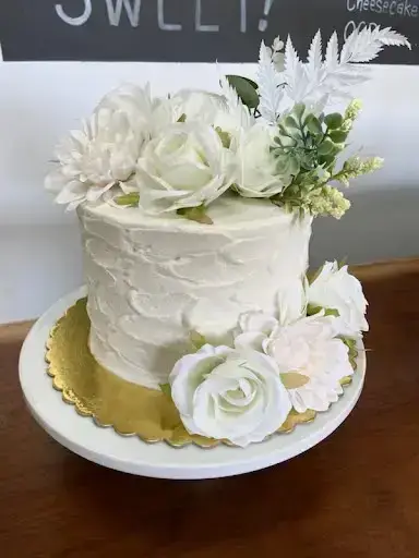 Unique textured icing w/ artificial flowers. (6″ Cake size featured in main product image)